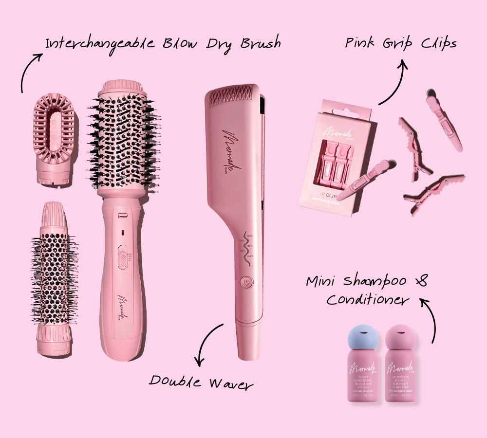 From beachy waves to bouncy blowouts, this kit has your hair covered. Meet the Hair Goals Kit, your all-in-one styling dream team. The Interchangeable Blow Dry Brush smooths, lifts and curls with three easy-to-swap heads for every style mood. The Double Waver creates soft, glossy waves in literal seconds with no skills or sectioning stress required. Pink Grip Clips keep everything secure while you style, and the Mini Shampoo & Conditioner Duo brings that fresh-hair feeling wherever you go.