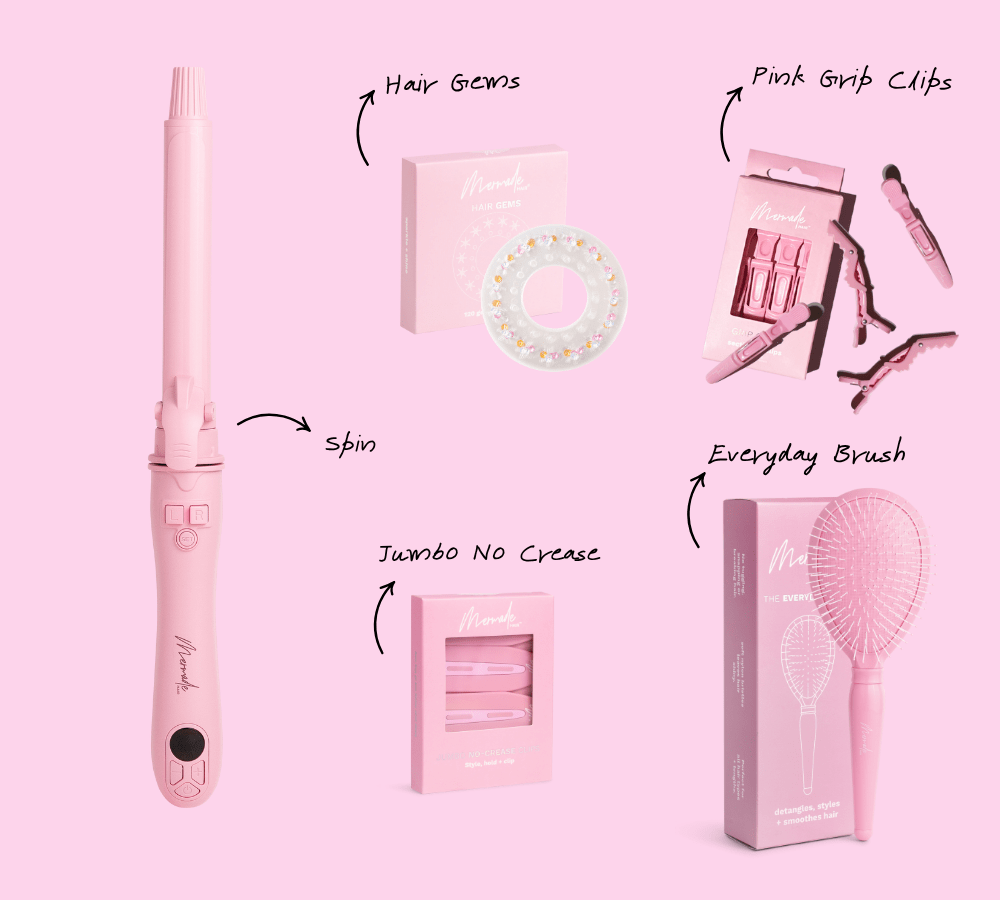 The Spin Perfect Curls Set by Mermade Hair™ is your ultimate kit for creating lush, salon-worthy curls with ease! At the heart of this bundle is the revolutionary Pink Spin, featuring a 360° rotating barrel that simplifies your curl routine. With adjustable heat settings and a sleek spinning action, it delivers long-lasting, glossy curls in seconds.